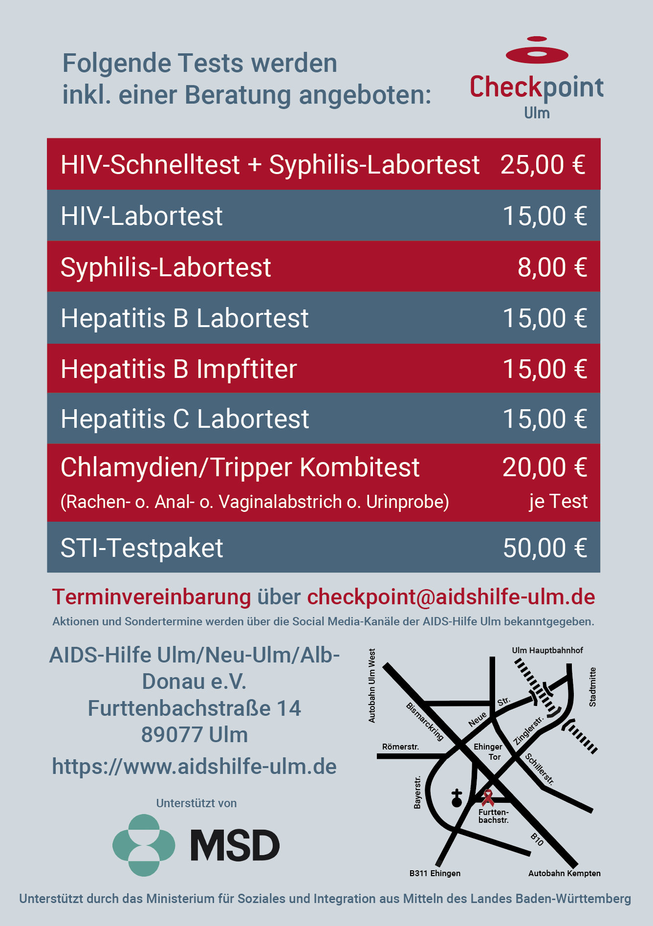 Für unseren Checkpoint am 26.04.2022 können Sie per Mail an Checkpoint@aidshilfe-ulm.de einen Termin buchen.