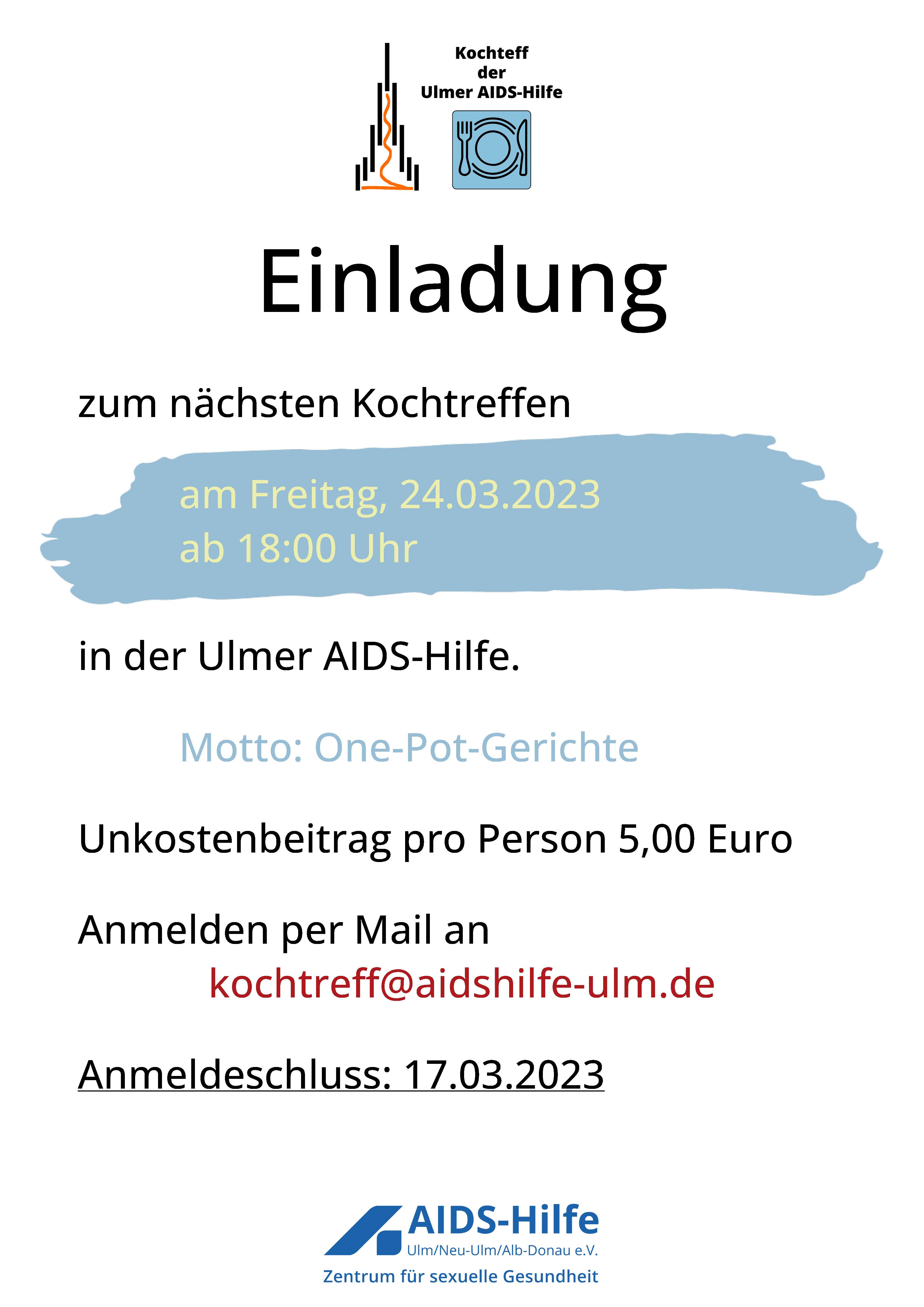 Alle sind willkommen. Wir bitten um vorherige Anmeldung per Email an kochtreff@aidshilfe-ulm.de